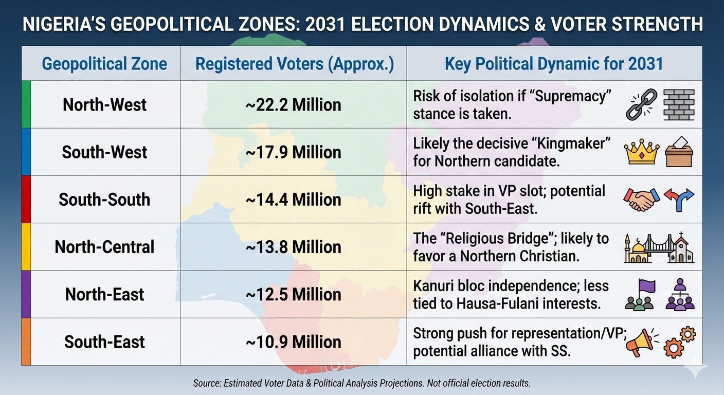 The "Gang-up" Math: If the North-West (29%) insists on producing a Presidential Candidate, the remaining 71% of the population (represented by the South, Middle Belt, and North-East) has a clear mathematical path to victory through a "Coalition"