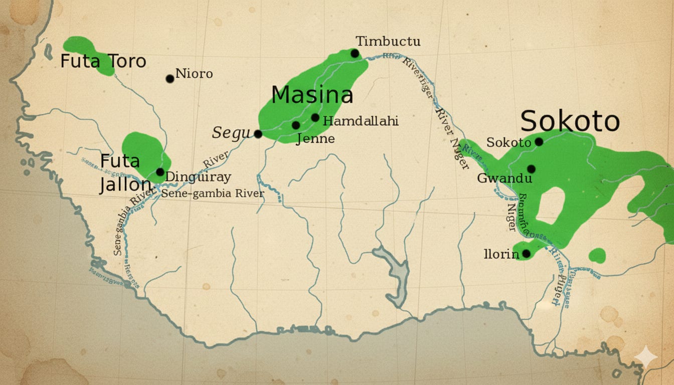 From Futa Jalon and Futa Toro along the Sene-gambia River to Macina and Tukulor Emirate in Mali along the River Niger, and Madibbo Adama’s raids and push for access to the Benue Valley along present-day Adamawa, an unmistakable pattern can be seen throughout history. Perhaps because Okunland from Lokoja is immediately west of the River Niger, it’s a continuum of “Greater Fulani,” but this doesn’t mean that all Fulani in the world “agree” or even had consensus about this goal or ambition.